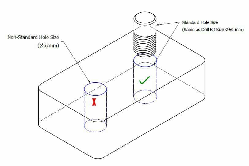 When designing holes, utilise standard drill bit sizes. Non-standard hole sizes would require end mills to finish the hillside to the specified non-standard dimension, significantly increasing machining time.