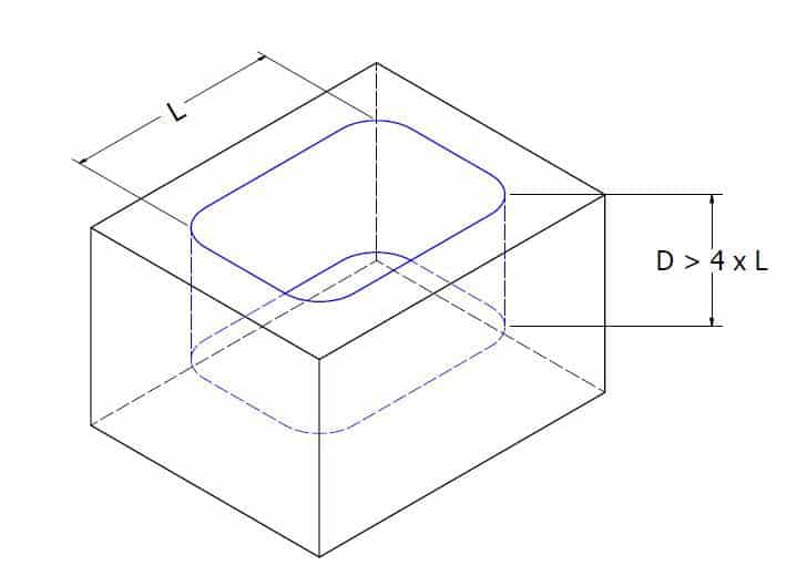 A simple way to avoid all of these is to design cavities with a minimum depth of four times their width. For example, a 10 mm wide cavity should not be deeper than 40 mm. Note that any cavity deeper than six times the diameter of the cutting tool is considered deep.