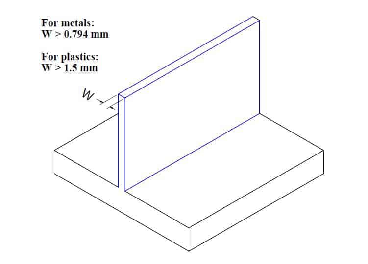 Thin walls take more time to manufacture. This is because they are fragile and require multiple passes at low cutting depth. They are also very likely to vibrate, and so machining them to specified tolerances is challenging and time-wasting. This increases machining time and, by implication, machining cost. To avoid this cost, design thicker walls. We recommended a minimum wall thickness of 0.8 mm for metals and 1.5 mm for plastics.