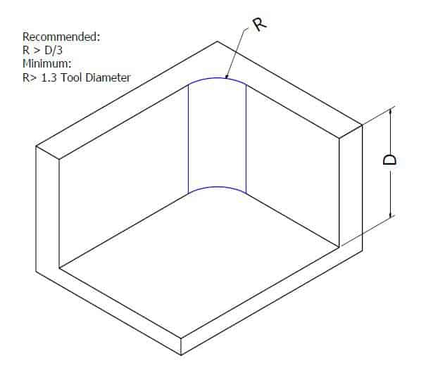 Because cutting tools are cylindrical, it is impossible to machine perfect 90° internal corners. The only way to achieve this is via EDM, which is a much more expensive manufacturing process than CNC machining. We highly recommend that you round all interior edges in your design, as this will save the time it will take the cutting room to attempt to produce sharp edges. We also recommend a sufficiently sized radius of at least 1/3 times the depth of the cavity. A small corner radius would require a tool with a small diameter, and because small tools cannot remove large amounts of material in one pass, multiple passes at slower speeds will be required, thereby increasing machining time and cost.
