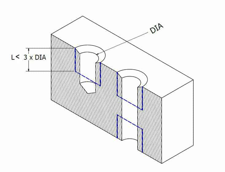 Threads provide very reliable connections. However, the strong thread connections occur in the first few threads, making long threads unnecessary. Long threaded holes may involve special tools and require more time and effort to machine. Always limit the depth of threads to a maximum of three times the hole diameter. When threading a blind hole, we recommend adding an unthreaded length of at least half the hole diameter at the bottom of the hole.