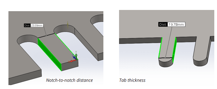 The notch to bend distance should be at least 3x the material thickness plus the radius of the bend. Tabs, on the other hand, must be 1 mm or the material thickness away from each other, whichever value is greatest.