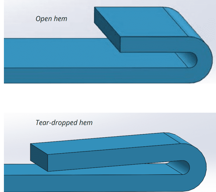 Teardrop hems should also have a minimum inside diameter that is equal to the material thickness. The opening should be a minimum of ¼x the material thickness, while the run length should be at least 4x the material thickness following the radius.