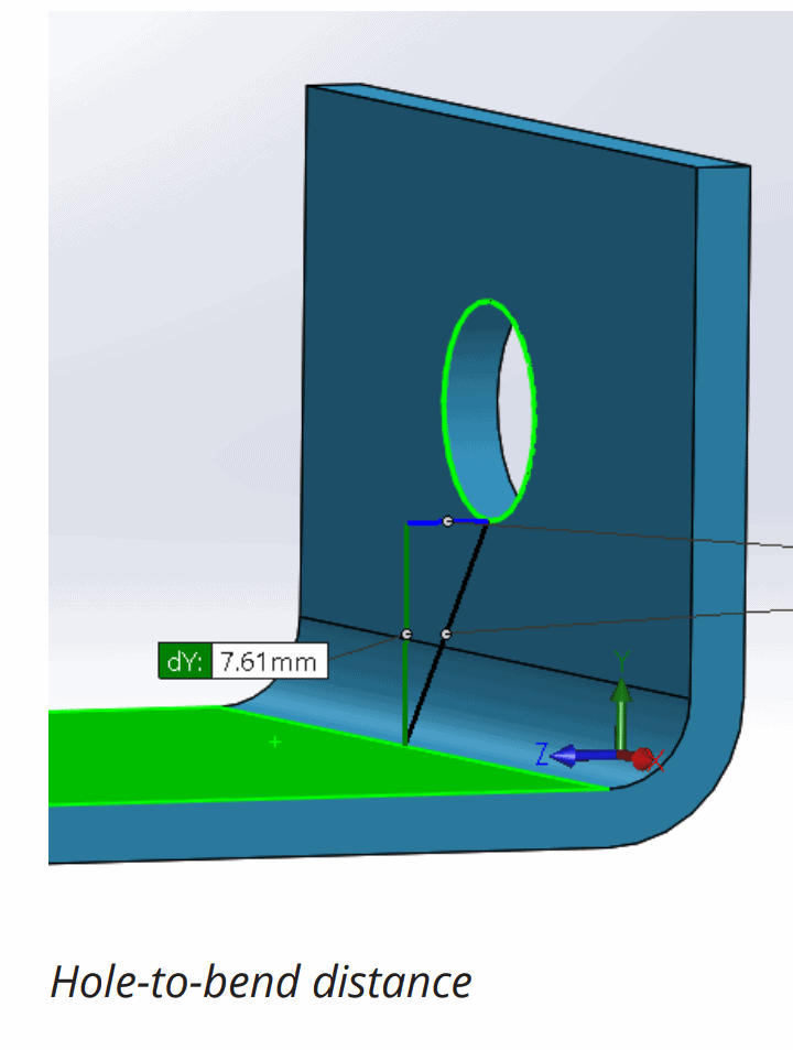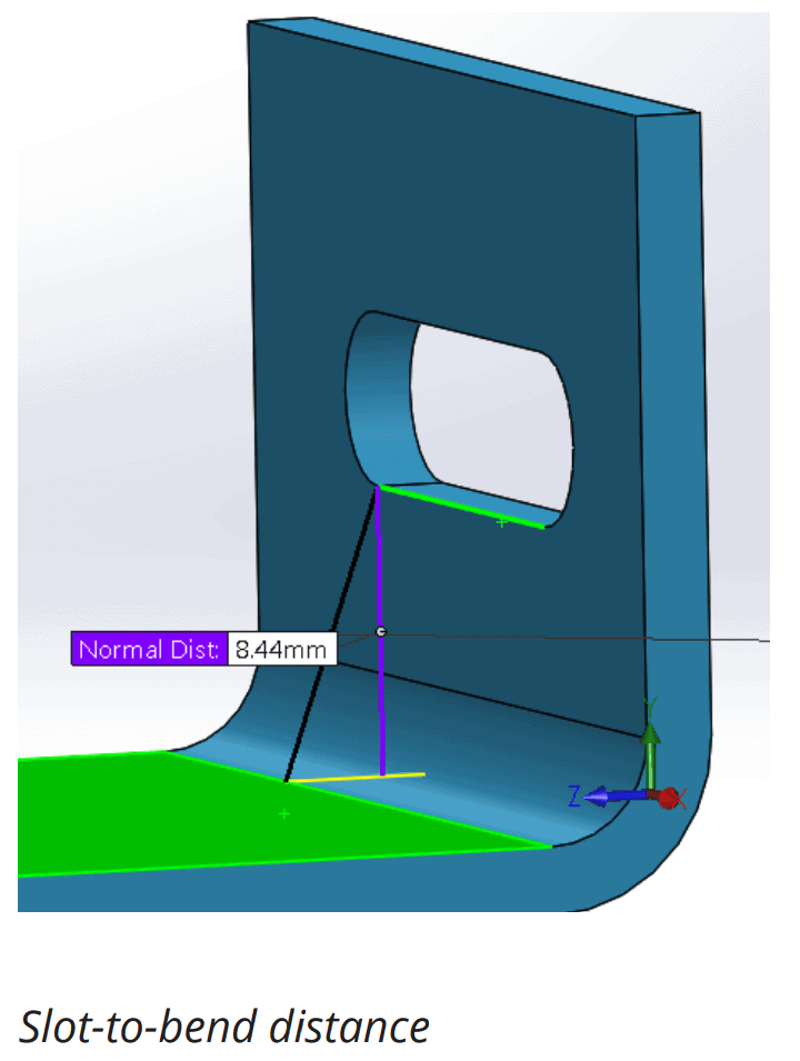 The distance of holes from the bend should be at least 2.5x the material thickness. Slots require more clearance. Slots should be placed at a distance of at least 4x the material thickness from the bend edges. This is because holes and slots are likely to deform when placed near a bend. Also, to avoid a bulging effect, place these features at a distance of at least 2x the material thickness from part edges.