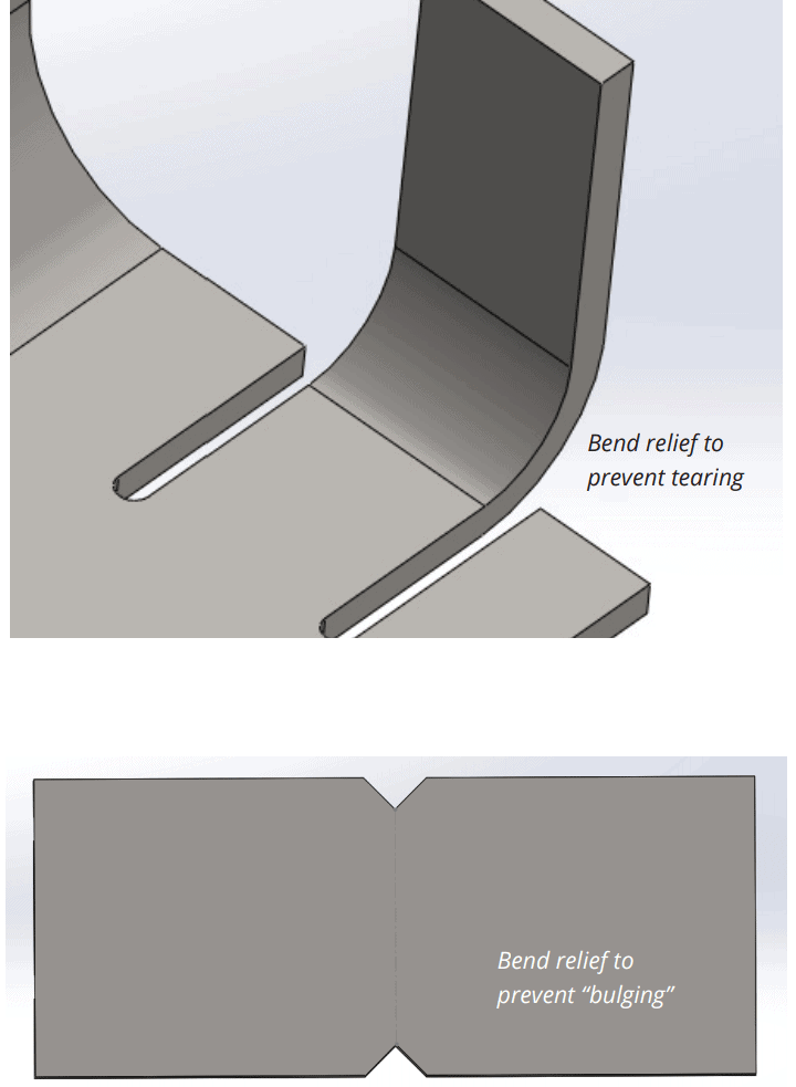 Relief cuts are essential in avoiding bulging and tearing at bends. The width of the relief cuts should at least be equal to the material thickness, and the length should be longer than the radius of the bend.