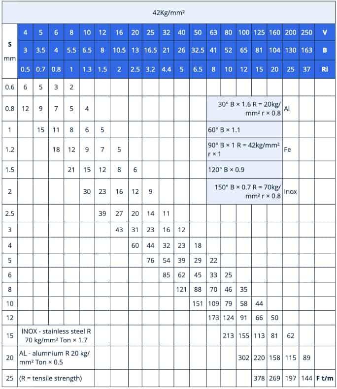 The chart below can be used to calculate the bending force required to V bend mild steel S235 of different thicknesses, in different shapes, at an angle of 90°. Mild steel S235 has a bending strength of 42 kg/mm². The variable parameters are as follows.