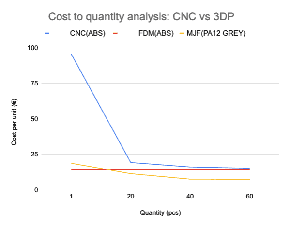 Conclusion: Go with 3D printing for small series and go with CNC machining for mid-large series as the cost reduces with quantity and gets much lower. Consider MJF 3D printing for mid-sized series as the technology allows to print several parts simultaneously, which reduces the price per unit.